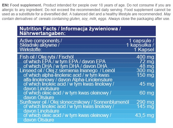 OMEGA 3-6-9 STRONG is a dietary supplement containing a composition of fish oil from linseed and sunflower, which provide omega 3, 6 and 9 acids.