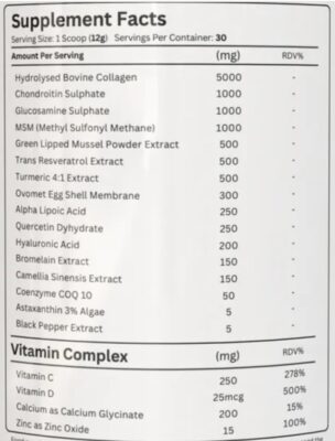 All bases are covered here with a more than complete joint formula, with Hydrolysed Collagen Peptides as the base. Also includes potent compounds such as Green Lipped Mussel, Egg Shell Membrane, Quercetin and the typical, MSM, Chondroitin, Glucosamine and more…