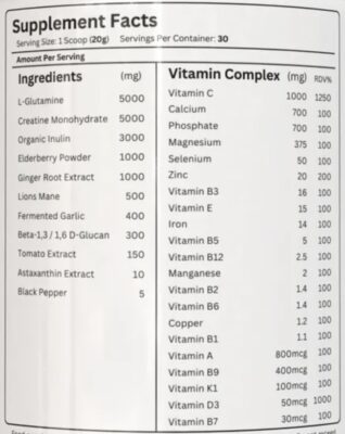 Combining the daily recommend levels of Creatine (5g), Glutamine (5g) along with a full panel of Multivitamins and then additionally some key ingredients for boosting your immune system such as ElderberryLions ManeGarlic Extract and more…