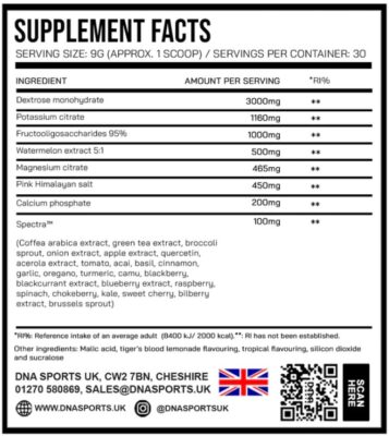 DNA Sports Hydra1 aims to deliver improved hydration whilst supporting digestive and cellular health in some amazing new flavours. This formulation provides all essential electrolytes required for improvements in hydration status, at efficacious dosages. Replenishing electrolytes supports hydration and optimizes muscle function making it a good choice for any time of the day. The electrolyte yield in Hydra1 accounts for real-life intake, where potassium intake tends to be low and where the average person does not struggle with dietary sodium. With this in mind we worked with a 2:1 ratio of potassium to sodium respectively.