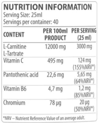 Water, L-carnitine L-tartrate, acid (citric acid), L-ascorbic acid, preservatives (potassium sorbate, sodium benzoate), sweeteners (acesulfame-K, sucralose), flavourings, calcium D-pantothenate, calcium d-pantothenate, calcium d-spantothenate, colouring agent (caramel), Pyridoxine hydrochloride, colouring agent (Ponceau 4R*), chromium picoulinate (III). *Ponceau 4R – May have a negative effect on activity and attention in children.
