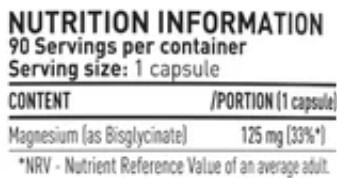 Ingredients: Magnesium bisglycinate, capsule (HPMC).