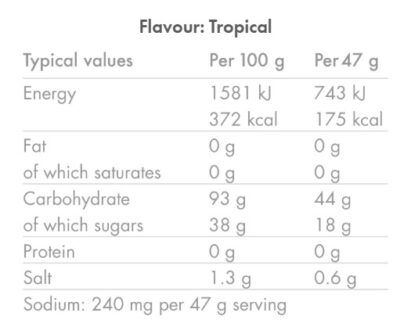 Maltodextrin, Fructose 32%, Natural Flavourings, Food Acids (Citric Acid, Malic Acid), Acidity Regulators (Sodium Citrates, Potassium Citrate), Sea Salt.. May contain traces of gluten, egg and/or milk.