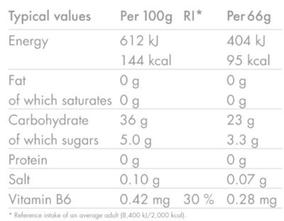 Water, Glucose Syrup, Maltodextrin, Fruit Juice Concentrate (Raspberry 1%, Blackcurrant, Blueberry 0.2%), Acidity Regulators (Sodium Citrates, Malic Acid, Citric Acid), Natural Flavourings, Preservatives (Potassium Sorbate, Sodium Benzoate), Sea Salt, Vitamin B6.