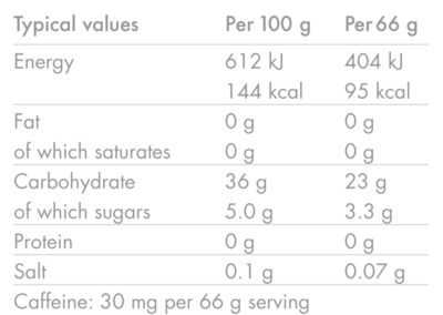 Contains caffeine. Not recommended for children or pregnant women. (45mg/100g).