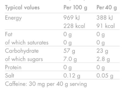 Contains caffeine. Not recommended for children or pregnant women. (75mg/100g).