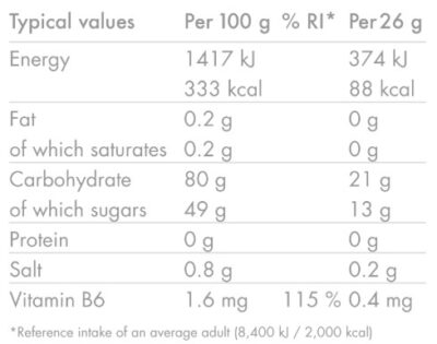 Glucose Syrup, Sugar, Modified Starch, Sodium Citrate, Food Acids (Citric Acid, Malic Acid), Potassium Citrate, Concentrates of Carrot, Blackcurrant and Cherry, Natural Flavourings, Vegetable Oil (Coconut, Rapeseed), Glazing Agent (Carnauba Wax), Pyridoxine Hydrochloride.