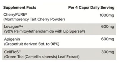 CherryPURE® (Montmorency Tart Cherry Powder), Levagen®+ (90% Palmitoylethanolamide with LipiSperse®), Apigenin (Grapefruit derived Std. to 98%), CellFlo6™ (Green Tea (Camellia sinensis) Leaf Extract), Bulking Agent (Stoneground Brown Rice Flour), Anti Caking Agent (Magnesium Stearate – vegetable derived) HPMC Capsule.