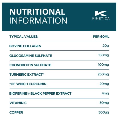 Each Orange & Mango flavoured shot contains 20g of Collagen and 50mg of Vitamin C which contributes to the formation of collagen. As little as a 10g dose of collagen has been shown to improve cartilage thickness. Kinetica Collagen has double the dose which is even better! We added glucosamine and chondroitin to assist in improving overall joint health- we never add anything that doesn’t play an important role in helping you achieve your goals.