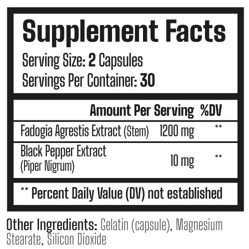 Contains 600 mg of Fadogia Agrestis per capsule, alongside 10 mg of Black Pepper Extract for absorption.