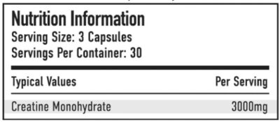 INGREDIENTS: Creatine Monohydrate. Magnesium Stearate. Hydroxypropyl Methylcelluose Capsule.
