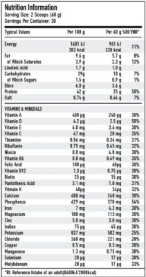 Ingredients: Protein Blend (45%) [Whey Protein Concentrate (Milk) (Emulsifier; Soya, Sunflower Lecithin), Milk Protein Concentrate, Micellar Casein (Milk)], Gluten-free Oat Flour (36%), Sunflower Seed Oil Powder, Vitamin & Mineral Premix (Calcium Citrate, Potassium Phosphate, Potassium Chloride, Sodium Chloride, Tri-Potassium Citrate, Magnesium Oxide, Vitamin C (Ascorbic Acid), Zinc Gluconate, Ferrous Fumerate, Vitamin E (dl-Alpha Tocopheryl Acetate), Vitamin K2 (Menaquinone-7), Manganese Gluconate, Niacin (Niacinamide), Vitamin A (Retinyl Acetate), Copper Gluconate, Pantothenic Acid (Calcium D-Pantothenate), D-Biotin, Vitamin D3 (Cholecalciferol), Riboflavin (Riboflavin 5-Phosphate Sodium), Vitamin B6 (Pyridoxine Hydrochloride), Folic Acid (Pteroylmonoglutamic Acid), Thiamine (Thiamin Hydrochloride), Vitamin B12 (Cyanocobalamin), Potassium Iodide, Sodium Molybdate, Sodium Selenite), Reduced Fat Cocoa Powder, Flavouring, Thickener (Sodium Carboxymethyl Cellulose, Xanthan Gum), MCT Oil Powder (Medium Chain Triglycerides), Flaxseed Powder, DigeZyme® Enzyme Complex (Amylase, Protease, Lactase, Lipase, Cellulase), Sweetener (Sucralose).