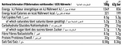 Protein Blend (36%)[Milk Proteins, Soya Protein Nuggets (Soya Protein Isolate), HydrolysedBovine Collagen], Milk Chocolate (16%)[Sweetener (Maltitol), Cocoa Butter, Whole Milk Powder, Cocoa Mass, Emulsifiers (Sunflower Lecithin, Rapeseed Lecithin), Natural Vanilla Flavour], Sweetener (Maltitol), Humectant (Vegetable Glycerol), Low Sugar Caramel Flavour Layer (10%) [Oligofructose, Humectant(Vegetable Glycerol), Shea Oil, Whey Protein Concentrate (Milk), Water, Palm Kernel, Butter (Milk), Palm Oil, Gelling Agent (Pectin), Emulsifiers (Mono- and Diglycerides of Fatty Acids, Sorbitan Tristearate, Rapeseed Lecithin, Sunflower Lecithin), Carob Germ Flour, Salt, Natural Flavouring, Colour (Plain Caramel)], Oligofructose, Cocoa Powder (1%), Roasted Peanuts (1%), Natural Flavourings, Colours (Plain Caramel, Calcium Carbonate), Sea Salt, Concentrate (Spirulina). [Milk chocolate: Cocoa Solids 42.0% Minimum, Milk Solids 18.2% Minimum]