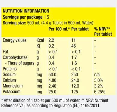 Energy: 11 Kcal / 46 Kj per tablet (2.2 Kcal / 9.2 Kj per 100ml)