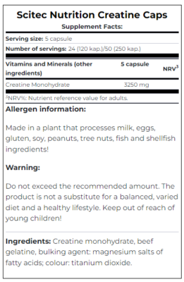 Scitec Creatine in a simple capsule serving. Added to your supplementation routine, it’s ideal for power athletes looking to improve performance.