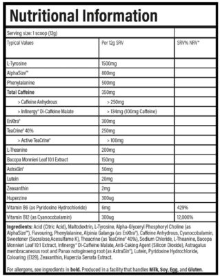 A combination of patented raw ingredients to drive focus to the highest levels. The primary being, Alphasize at a huge 800 mg! This is unseen in any other product . We also use enXtra, Teacrine and infinergy, to further drive focus and endurance .