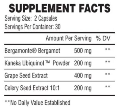 200mg of 10:1 Celery Seed Extract with 400mg Grapeseed extract included to aid in lowering hypertension. In combination with the Bergamonte® Citrus Bergamot and Kaneka® Ubiquinol to combat dyslipidemia.