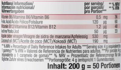 Inulin, Apple cider vinegar, Coconut oil (95% medium chain triglycerides (MCT), Cocos nucifera), water, Gelling agent, Pectin, Acidifier, Citric acid, Coconut oil, Rapeseed oil, Coating agent, Carnauba wax, Apple flavouring, Sodium chloride, Colouring, Anthocyanin, Zumo beetroot extract (Beta vulgaris), Vitamin B6 (Pyridoxine HCl), Pomegranate juice powder, Folic acid (Pteroylmonoglutamic acid), Potassium iodide, Beetroot juice powder, Vitamin B12 (Cyanocobalamin).