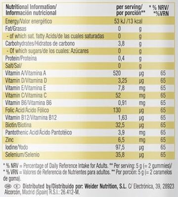 Multivit by Weider is an innovative, revolutionary way to take vitamin and mineral supplements. Vitamins and minerals are essential nutrients and should be consumed as supplements to food. However, the reality is that our increasingly fast-paced lifestyle, leaves little time for healthy diets, sometimes resulting in nutritional deficiencies. Adding a complete multivitamin supplement to your diet such as Multivit makes it much easier to ensure an adequate intake of these nutrients. It is a simple and sweet way to make a difference in your diet. The Multivit formula is super complete. Taking two Multivit gummies a day provides 65percentage of our daily requirements of these vitamins and minerals, Multivit contains 9 vitamins and 3 minerals that help with some of our most important body functions: Vitamin A: immunological function, absorption of iron and skin care. Vitamin D: proper absorption of calcium, care of bones and muscles. Vitamin E: powerful antioxidant. Vitamin C: care of the immune system, formation of skin, cartilage and collagen. Powerful antioxidant. Vitamin B6: energy production, nervous system function and protein metabolism. Vitamin B5: energy production, hormone synthesis, combats tiredness and fatigue. Vitamin B12: energy metabolism, red blood cell formation, nervous system and cognitive function. Folic acid: synthesis of amino acids and formation of new cells. Biotin: energy production and skin, hair and nail care. Zinc: energy production, fertility and antioxidant protection. Iodine: essential for brain function, skin and proper metabolism. Selenium: care of the immune system, skin and nails. Powerful antioxidant. As you can see it is not simply candy, Multivit is 100percentage sugar free and 2 gummies provide a mere 17 kcal, so you don’t have to worry about your figure or your teeth, Making sure you take your vitamins has never been so enjoyable and fun. No more boring pills. Now, taking vitamins will be the most enjoyable part of the day.